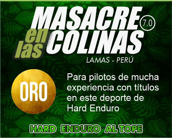 Para pilotos de mucha experiencia con títulos en este deporte de Hard Enduro ya sea Regionales, Nacionales e Internacionales. Las señalizaciones o cintas de la categoría ORO serán cintas de color blanco. Los numeros seran del 1 al 20, se tomara en cuenta el tiempo de registro para su numero.
